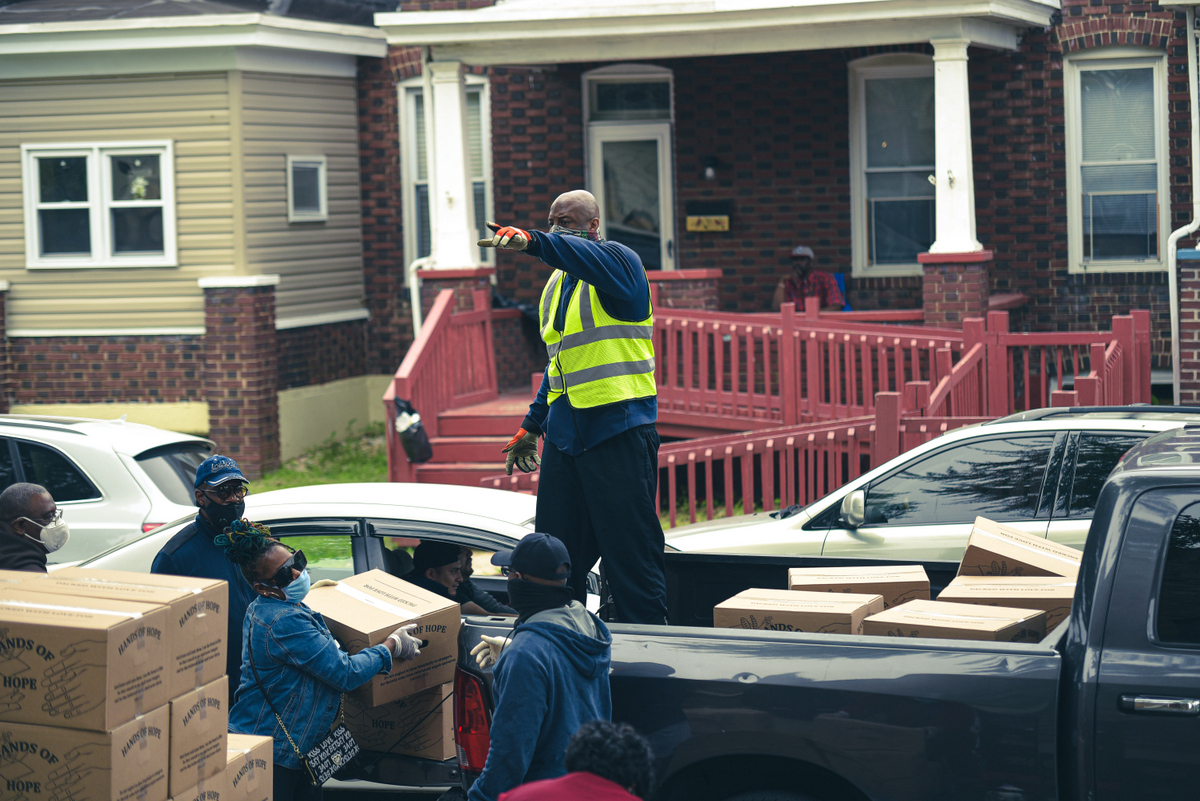 Standing on and pointing is Maurice Blanding food delivery volunteer giving instructions on where food orders should be delivered. (Photo by J.J. McQueen)