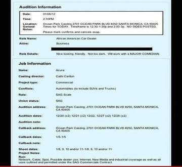 Courtesy Photo- Casting call document for Acuras 30-second ad Super Bowl.