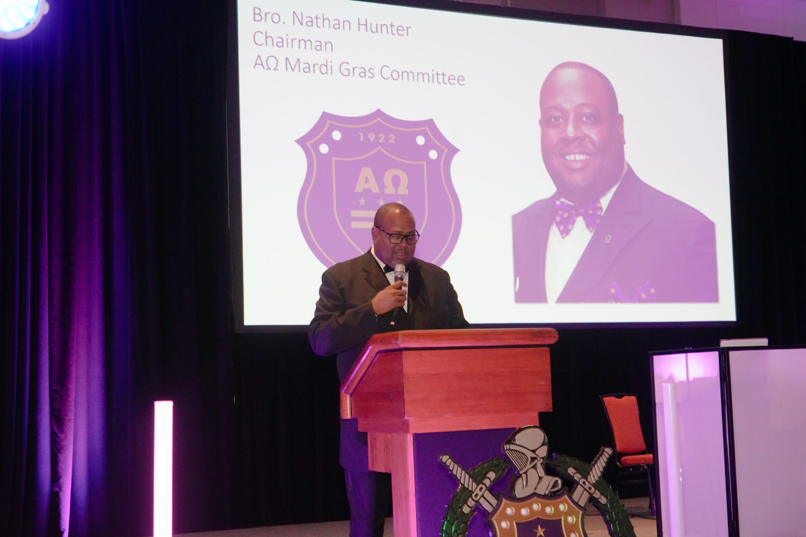 Brother Nathan Hunter, chairman of the Mardi Gras Committee for the Alpha Omega Chapter of Omega Psi Phi Fraternity Inc., speaks to those gathered for the annual ball on Feb. 7 in Bethesda, Md.