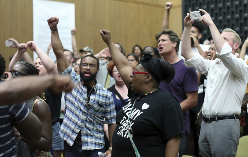 Protesters yell during the Charlottesville City Council meeting Monday, Aug. 21, 2017, in Charlottesville, Va. Anger boiled over at the first Charlottesville City Council meeting since a white nationalist rally in the city descended into violent chaos, with some residents screaming and cursing at councilors Monday night and calling for their resignations. (Andrew Shurtleff/The Daily Progress via AP)