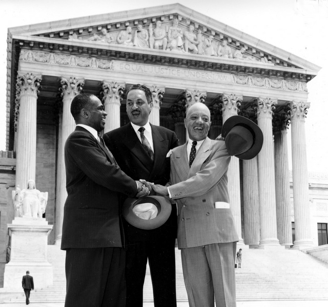 FILE – In this May 17, 1954, file photo, George E.C. Hayes, left, Thurgood Marshall, center, and James M. Nabrit join hands outside the U.S. Supreme Court in Washington, D.C., after justices declared in the Brown v. Board of Education decision that separate but equal schools for black children were unconstitutional. Three years after that ruling, President Dwight D. Eisenhower dispatched federal troops to Little Rock, Ark., to escort nine black children as they integrated Central High School. The 60th anniversary of the Little Rock Nine’s enrollment is Monday, Sept. 25, 2017. (AP Photo/File)