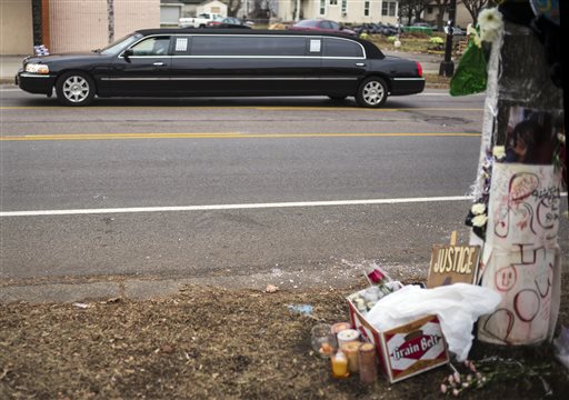 One of the family limousines for the funeral procession of Jamar Clark passes by the site of his shooting, Wednesday, Nov. 25, 2015, in Minneapolis. Clark, whose death in a confrontation with police, has sparked more than a week of protests. (Richard Tsong-Taatarii/Star Tribune via AP) MANDATORY CREDIT; ST. PAUL PIONEER PRESS OUT; MAGS OUT; TWIN CITIES LOCAL TELEVISION OUT
