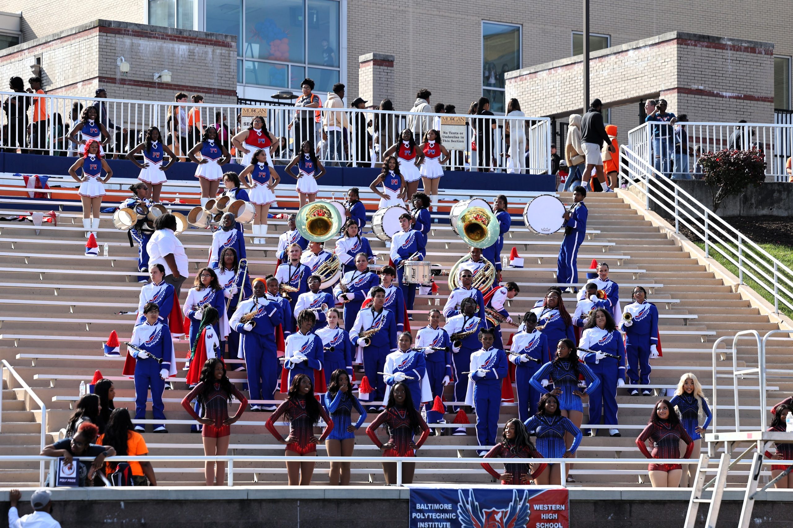 The Baltimore Polytechnic Institute’s marching band and dancers entertain the crowd.