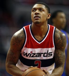 Washington Wizards guard Bradley Beal (3) shoots a free throw in the second half of an NBA basketball game against the Detroit Pistons, Saturday, Feb. 28, 2015, in Washington. The Wizards won 99-95. (AP Photo/Alex Brandon)