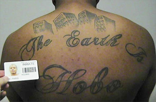 This undated photo in a court filing provided by the United States Attorney’s office in Chicago, shows Paris Poe’s back tattoo that reads “The Earth Is Our Turf”, and Hobo. Poe is one of six defendants on trial for racketeering and other charges are purported leaders of the widely feared Hobos, a South Side gang that federal prosecutors said murdered, maimed and tortured their way into control of some of Chicago’s most lucrative drug markets. Their federal trial begins Wednesday, Sept. 14, 2016 with opening statements in Chicago. (United States Attorney’s office in Chicago via AP)