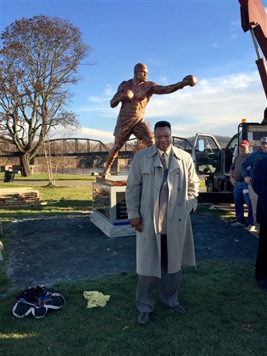 In this photo taken Monday, Dec. 7, 2015, Hall of Fame boxer Larry Holmes poses by a statue of his likeness as construction crews complete the installation of the new statue at Scott Park, where the Lehigh river runs into the Delaware in Easton, Pa. A dedication of the statue will take place Sunday, Dec. 13. (Tom Shortell/The Morning Call via AP) THE EXPRESS-TIMES OUT; WFMZ OUT; MANDATORY CREDIT