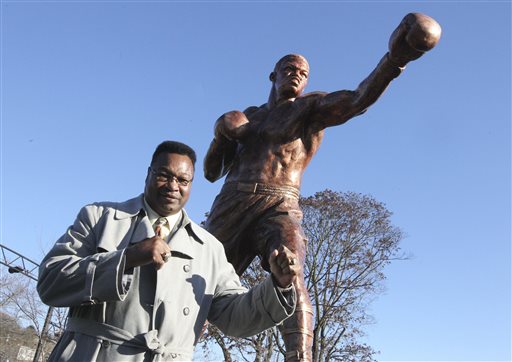 In this photo taken Monday, Dec. 7, 2015, Hall of Fame boxer Larry Holmes poses by a statue of his likeness as construction crews complete the installation of the new statue at Scott Park, where the Lehigh river runs into the Delaware in Easton, Pa. A dedication of the statue will take place Sunday, Dec. 13. (Sue Beyer/The Express-Times via AP)