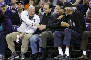 Forme Microsoft CEO Steve Ballmer, left, shakes hands with former NBA players Bill Russell, right, and “Downtown” Freddie Brown as Omar Lee looks on during an NCAA college basketball game between Washington and Oregon State in Seattle. Ballmer is officially the new owner of the Los Angeles Clippers. The team says the sale closed Tuesday, Aug. 12, 2014, after a California court confirmed the authority of Shelly Sterling, on behalf of the Sterling Family Trust, to sell the franchise. (AP Photo/Elaine Thompson, File)