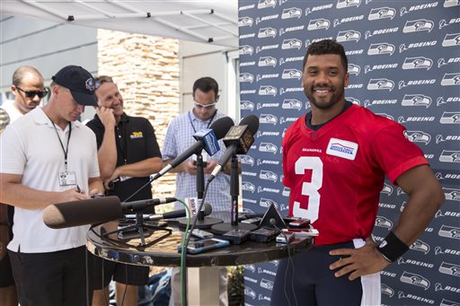 Seattle Seahawks quarterback Russell Wilson, right, smiles during a news conference after NFL football training camp on Friday, July 31, 2015, in Renton, Wash. Wilson signed a four-year contract extension with the Seahawks on Friday, keeping him with the franchise that took him in the third round of the 2012 draft and watched him become one of the most successful young quarterbacks in NFL history. (AP Photo/Stephen Brashear)