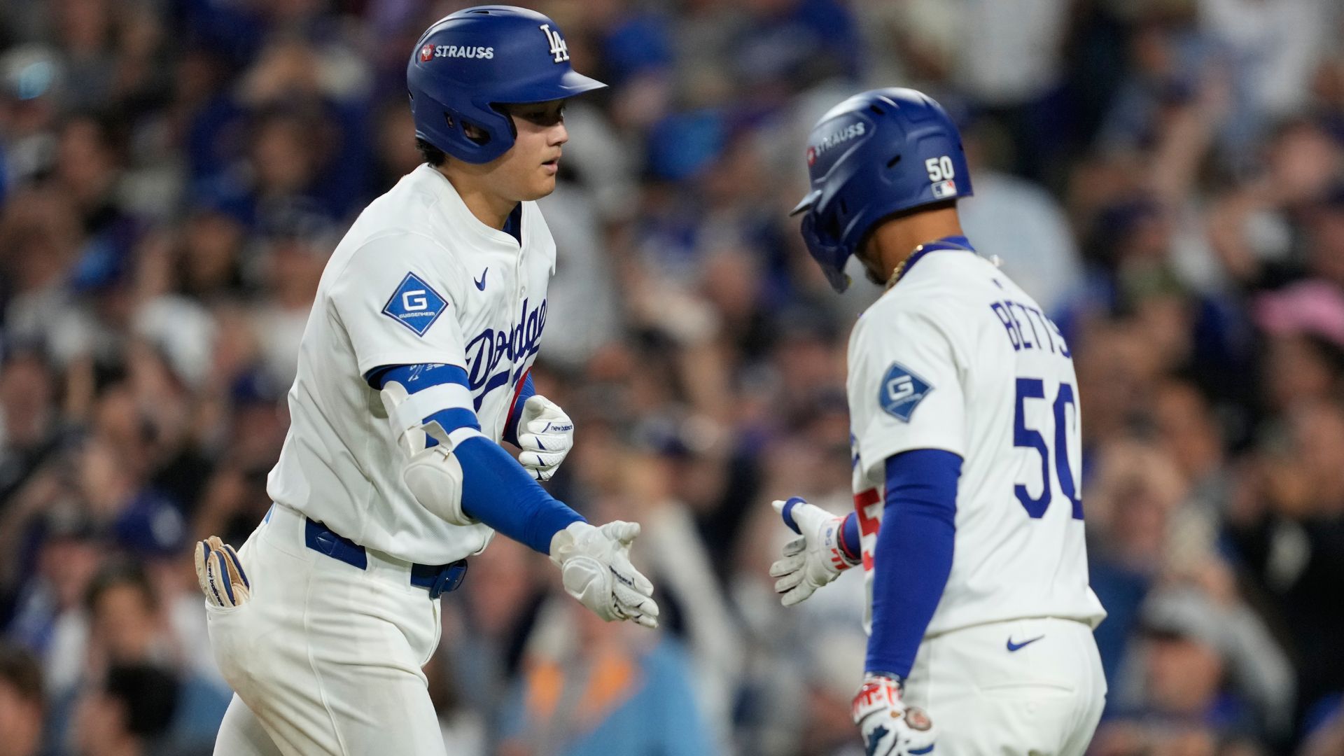 Los Angeles Dodgers two-way player Shohei Ohtani (#17) celebrates with shortstop Mookie Betts (#50) after hitting a home run during Game 4 of baseball’s National League Championship Series against the Milwaukee Brewers, Friday, Oct. 17, 2025, in Los Angeles. (AP Photo/Ashley Landis)