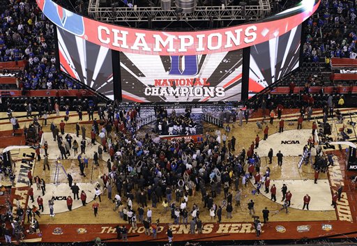 Duke players celebrate with the trophy after their 68-63 victory over Wisconsin in the NCAA Final Four college basketball tournament championship game Monday, April 6, 2015, in Indianapolis. (AP Photo/David J. Phillip)