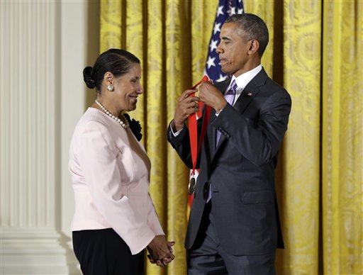 President Barack Obama awards the 2014 National Humanities Medal to Historian Evelyn Brooks Higginbotham of Auburndale, Mass., during a ceremony in the East Room at the White House in Washington, Thursday, Sept. 10, 2015. (AP Photo/Manuel Balce Ceneta)