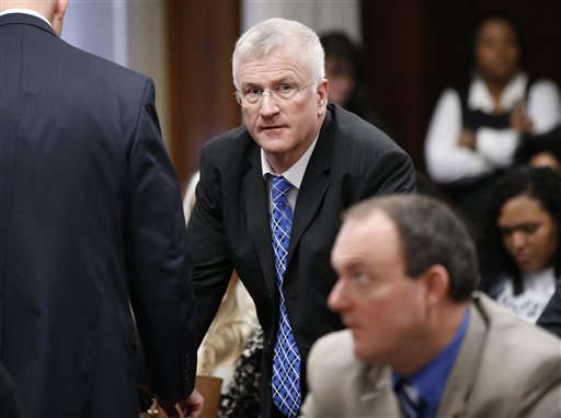 Eric Holtzclaw, the father of Daniel Holtzclaw, waits for his son’s sentencing in Oklahoma City, Thursday, Jan. 21, 2016. The sentencing hearing for Daniel Holtzclaw, a former Oklahoma City police officer convicted of raping and sexually victimizing several women on his beat, has been delayed as a judge considers the defenses motion for a new trial. (AP Photo/Sue Ogrocki, Pool)