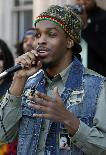 FILE – In this Sunday, April 20, 2014, file photo, Jawara McIntosh, son of legendary Reggae icon and a pro-marijuana activist, Peter Tosh, sings a song as he stands with a large gathering in front of the New Jersey Statehouse in Trenton, N.J. McIntosh was hospitalized since suffering traumatic brain injuries in the attack in February 2017 at the Bergen County jail, where he was serving a six-month sentence after pleading guilty to marijuana possession, his family said. (AP Photo/Mel Evans, File)
