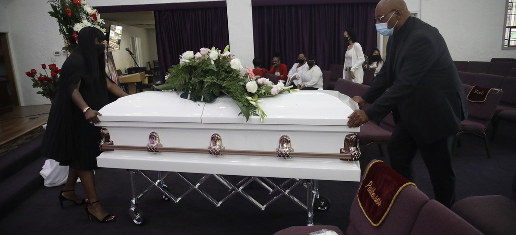Candy Boyd, left, owner of Boyd Funeral Home, is helped as she brings in the body of Lydia Nunez, who died from COVID-19, during a funeral service at the Metropolitan Baptist Church Tuesday, July 21, 2020, in Los Angeles. When people began dying from the coronavirus in the United States, for a few weeks funeral home owner Boyd declined to receive the remains of such patients. (AP Photo/Marcio Jose Sanchez)