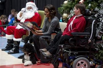AP Photo/Jacquelyn Martin-Dressed as Santa, Gavin Lindberg, left, and Isaiah Horst, 15, right, listen as first lady Michelle Obama reads a holiday story, “The Night Before Christmas” to children at Children’s National Health System in Washington, Monday, Dec. 16, 2013. Michelle Obama read a story and answered children’s questions at the Childrens Hospital.