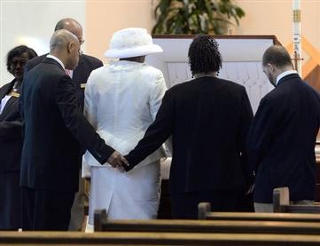 Courtesy Photo-Deborah Gibbs Adams, center, pays her final respects to her husband Floyd Adams, Jr., Friday Feb. 7, 2014 during his funeral service at St. James Catholic Church in Savannah Ga. Floyd Adams, Jr was Savannah’s first black mayor. Adams died Saturday, Feb. 1, 2014 at age 68. Photo/Savannah Morning News, Richard Burkhart