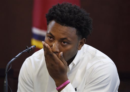 Former football player Jaborian “Tip” McKenzie testifies during day three of former Vanderbilt football player Cory Batey’s trial in Judge Monte Watkins’ courtroom in the A.A. Birch building in Nashville, Tenn., Wednesday, April 6, 2016. (Samuel M. Simpkins/The Tennessean via AP) MANDATORY CREDIT