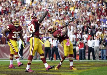 AP Photo/Pablo Martinez Monsivais-Washington Redskins running back Alfred Morris (46) reacts after his touchdown with fullback Darrel Young (36), and tight end Fred Davis (83) during the first half of an NFL football game against the Minnesota Vikings, Sunday, Oct. 14, 2012, in Landover, Md.