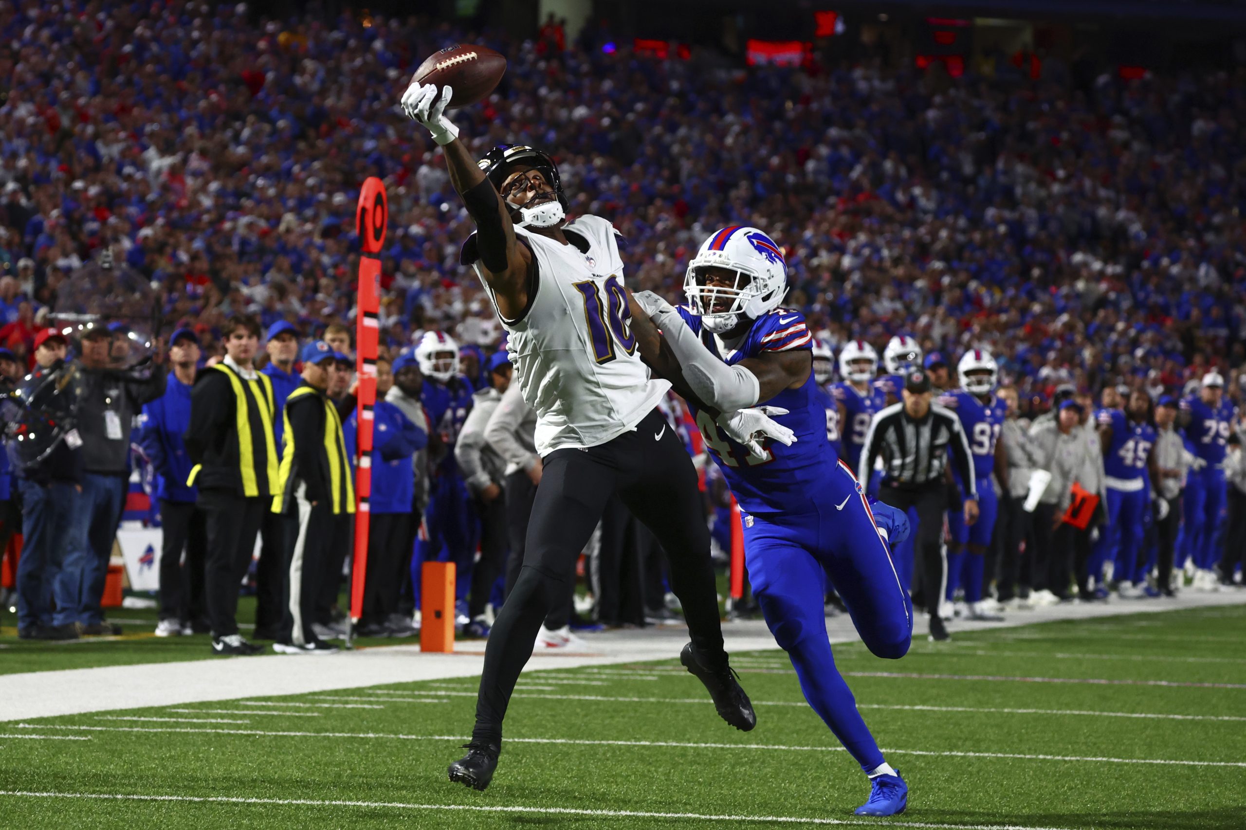 Baltimore Ravens wide receiver DeAndre Hopkins (#10) grabs a pass for a touchdown in front of Buffalo Bills linebacker Keonta Jenkins (#49) during the second half of their Sept. 7 football game. (AP Photo/Jeffrey T. Barnes)