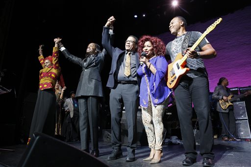 Angelique Kidjo, Vernice White, Herbie Hancock, Chaka Khan, and Ray Parker Jr. take a bow at the 13th annual “A Great Night in Harlem” gala concert, presented by The Jazz Foundation of America to benefit The Jazz Musicians Emergency Fund, at The Apollo Theater on Friday, Oct. 24, 2014, in New York. This year’s Lifetime Achievement Award honoree is musician Herbie Hancock. (Photo by Mark Von Holden/Invision/AP)