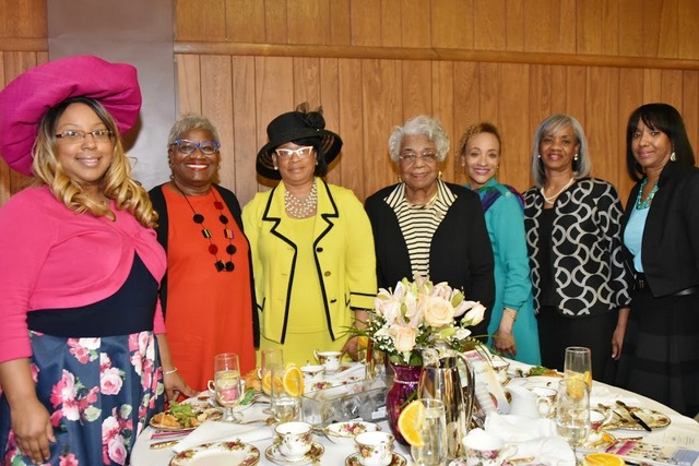 (From L-R) Lisa McNeill, Landa McLaurin, president National Coalition of 100 Black Women Baltimore Metropolitan chapter, Michele Emery, National President, National Coalition of 100 Black Women, Dr. Anne O. Emery, Sheila Davenport, Valerie Ramsey, Michelle Queen at the High Tea Saluting Women of the AFRO. (Photo by A. Lois De Laine)