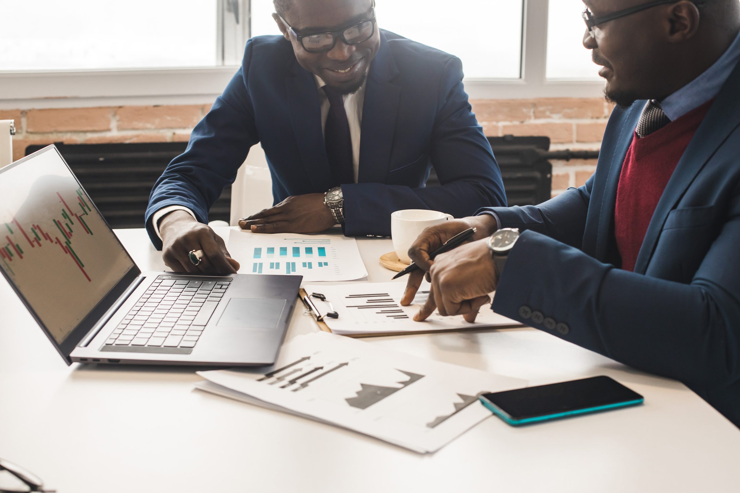 Two dark-skinned partners of an African American businessman at a meeting work on a laptop with a stock market trading terminal. Training in technical analysis and the study of economic indicators,