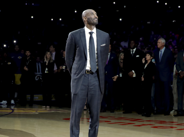 FILE – In this Dec. 18, 2017 file photo, former Los Angeles Laker Kobe Bryant arrives for a halftime ceremony, retiring both of his jersey’s during an NBA basketball game between the Los Angeles Lakers and the Golden State Warriors, in Los Angeles. Bryant is nominated for an Oscar in the animated short category for “Dear Basketball,” based on a poem he wrote in 2015 announcing his impending retirement from basketball. (AP Photo/Chris Carlson, File)
