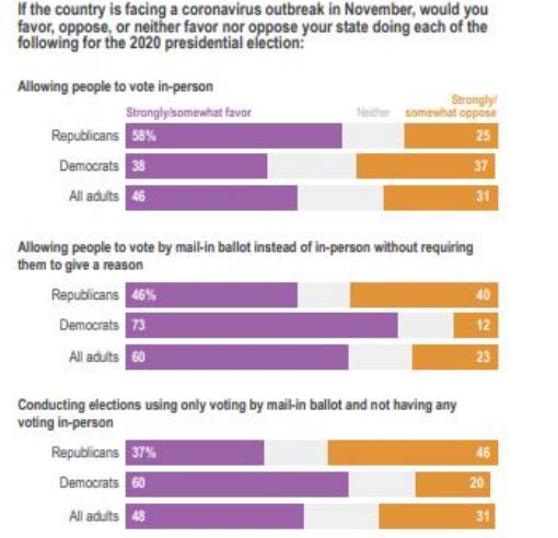 A new AP-NORC poll finds that 6 in 10 Americans would support their state conducting vote by mail elections in November due to a coronavirus outbreak. Democrats are more likely than Republicans to favor alternatives to in-person voting.;