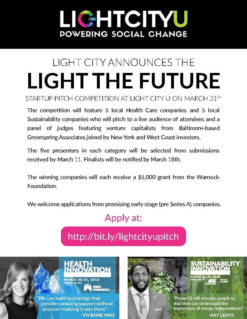 The Baltimore Office of Promotion & The Arts is hosting the inaugural Light City Baltimore, an international lightfestival featuring art, music and performances March 28-April 3. The Light the Future Startup Pitch Competition, will feature ten local startups equally split between the health care and sustainability disciplines pitching to a live audience of attendees and a panel of judges composed of venture capitalists from Baltimore and around the country on March 31. The two winning companies will each receive a $5,000 grant from the Warnock Foundation. A full list of speakers and sessions can be found for each conference at www.lightcity.org/lcu. Scholarships are available for those who want to be a part of this conference, but cannot afford a ticket. For more information on Light City Baltimore, visit www.lightcity.org or call 410-752-8632.
