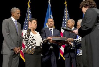 President Barack Obama watches as Supreme Court Justice Sonia Sotomayor, right, administers the oath of office to Attorney General Loretta Lynch, second from left, during an investiture ceremony, Wednesday, June 17, 2015, at the Warner Theatre in Washington. From left are, the president Lynch, Lynch’s husband Stephen Hargrove, her parents Lorenzo and Lorine Lynch and Sotomayor. (AP Photo/Carolyn Kaster)