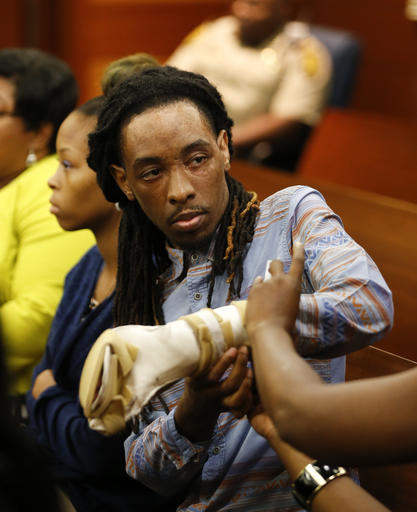 Burn victim Anthony Gooden gets help with his injured hand during a break in a trial for Martin Blackwell in Atlanta, Wednesday, Aug. 24, 2016. Blackwell is accused of pouring hot water on Gooden and his friend as they slept. (AP Photo/John Bazemore)