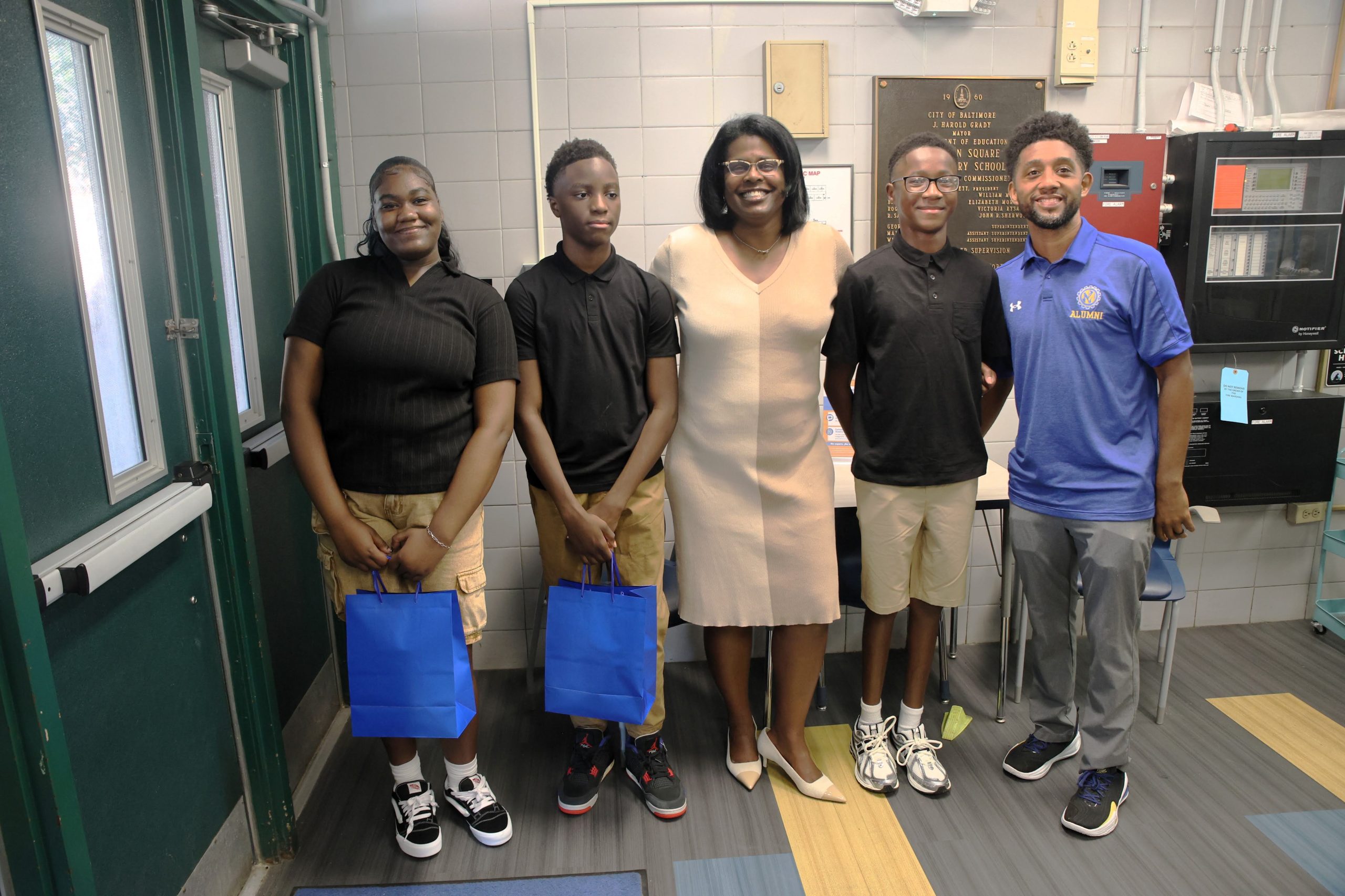 Eighth-graders Madison Muse (left), Brandon Height and Kaden Boxdale, of Franklin Square Elementary/Middle School welcome CEO Dr. Sonja Brookins Santelises and Mayor Brandon M. Scott on Aug. 25.