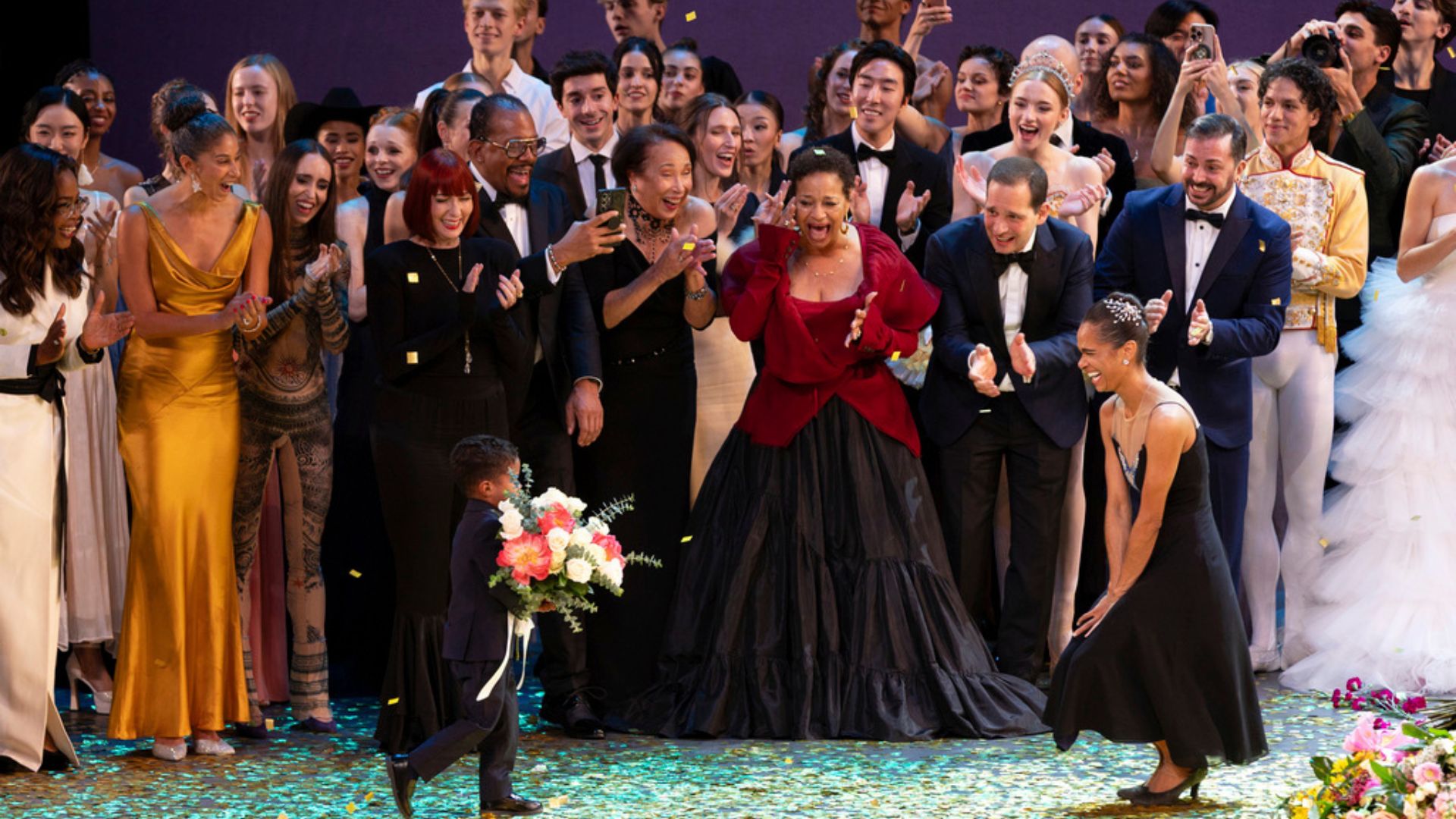 Dancer Misty Copeland, right, takes a bow during curtain calls with her son, Jackson, at her retirement performance from American Ballet Theatre at the David H. Koch Theater at Lincoln Center, Oct. 22, 2025, in New York.