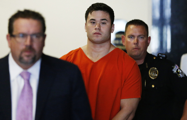 FILE – In this Wednesday, Sept. 3, 2014, file photo, Daniel Holtzclaw, center, an Oklahoma City police officer accused of sexually assaulting women he encountered while on patrol in neighborhoods near the state Capitol, is led into a courtroom for a bond hearing, in Oklahoma City. A preliminary hearing is scheduled Monday, Nov. 17, 2014, for Holtzclaw. (AP Photo/Sue Ogrocki, File)