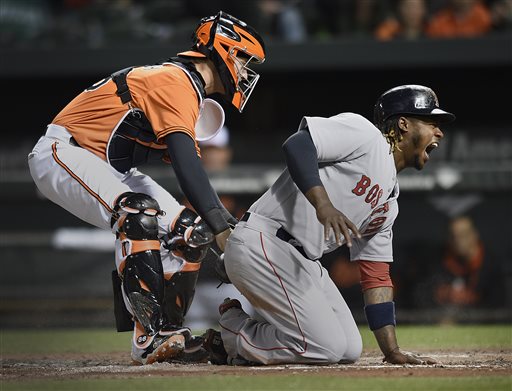 Baltimore Orioles catcher Caleb Joseph, left, tags out Boston Red Sox’s Hanley Ramirez who was advancing on a fly ball hit by Allen Craig to left center field in the fourth inning of a baseball game, Saturday, April 25, 2015, in Baltimore. (AP Photo/Gail Burton)