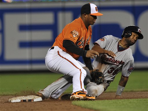 Baltimore Orioles second baseman Jonathan Schoop, right, tags out Minnesota Twins Danny Santana on a steal attempt in the third inning of a baseball game, Saturday, Aug. 30, 2014, in Baltimore.(AP Photo/Gail Burton)
