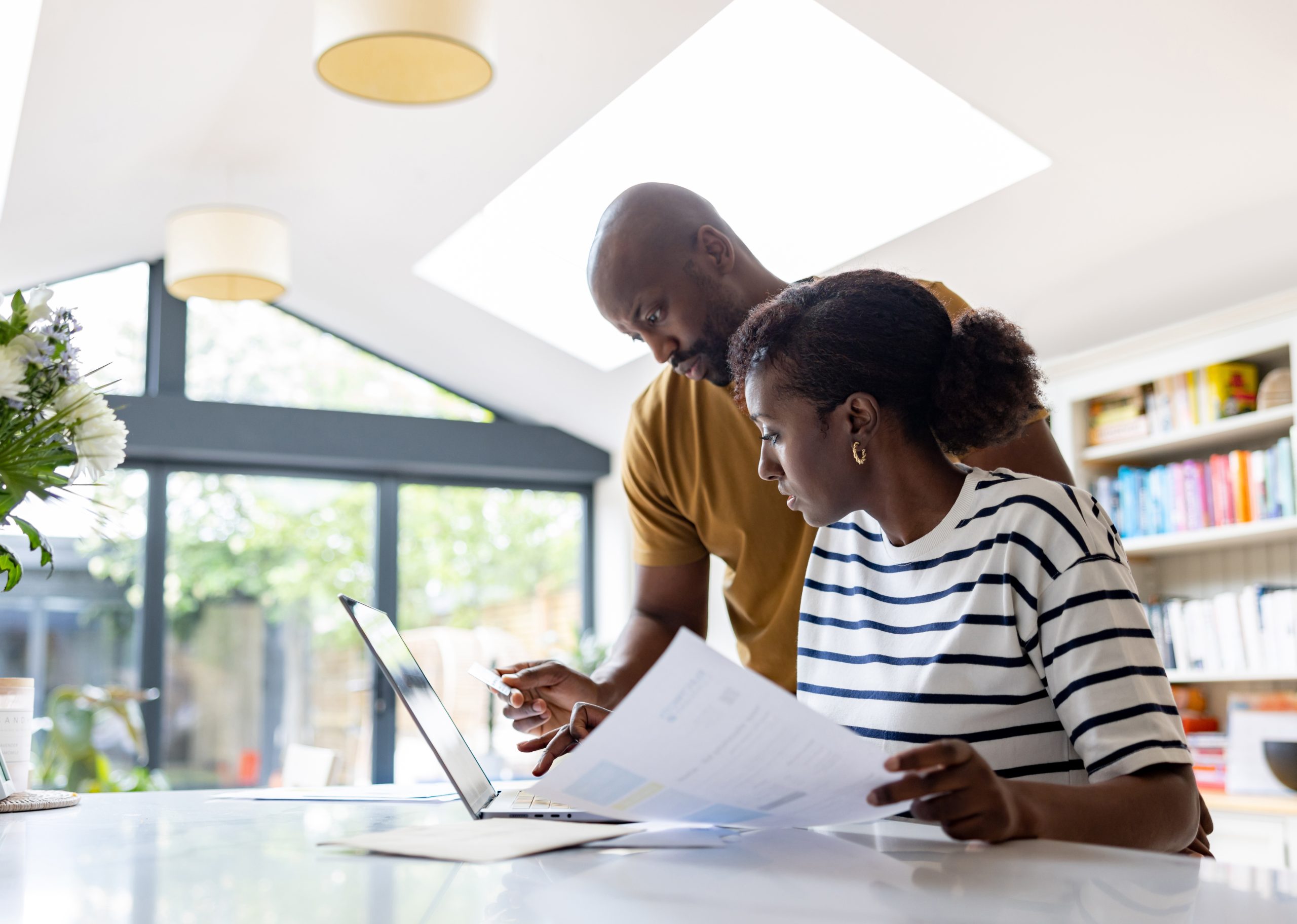 African American couple paying bills online at home African American couple paying bills online at home using a laptop computer – home finances concepts