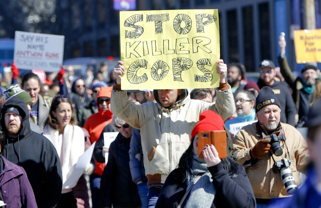 Marchers move through the streets Saturday, March 23, 2019 in Pittsburgh, Pa. The group was calling for justice the day after former East Pittsburgh police officer Michael Rosfeld was acquitted in the homicide trial where he was charged with shooting and killing 17-year-old Antwon Rose II last summer near Pittsburgh. (AP Photo/Keith Srakocic)