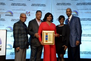 Endura Govan, owner of D.C.-based International Business Kids receives an award from the Rainbow Push Coalition. (left to right) Steve Smith, executive director, Public Policy Institute, Government Relations &Telecommunications Project; Rev. Jesse Jackson, Eudura Govan and the event emcees. (Photo by Rob Roberts)