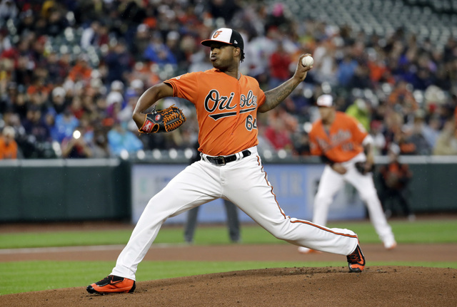 Baltimore Orioles starting pitcher Jayson Aquino throws to the Boston Red Sox in the first inning of a baseball game in Baltimore, Saturday, April 22, 2017. (AP Photo/Patrick Semansky)