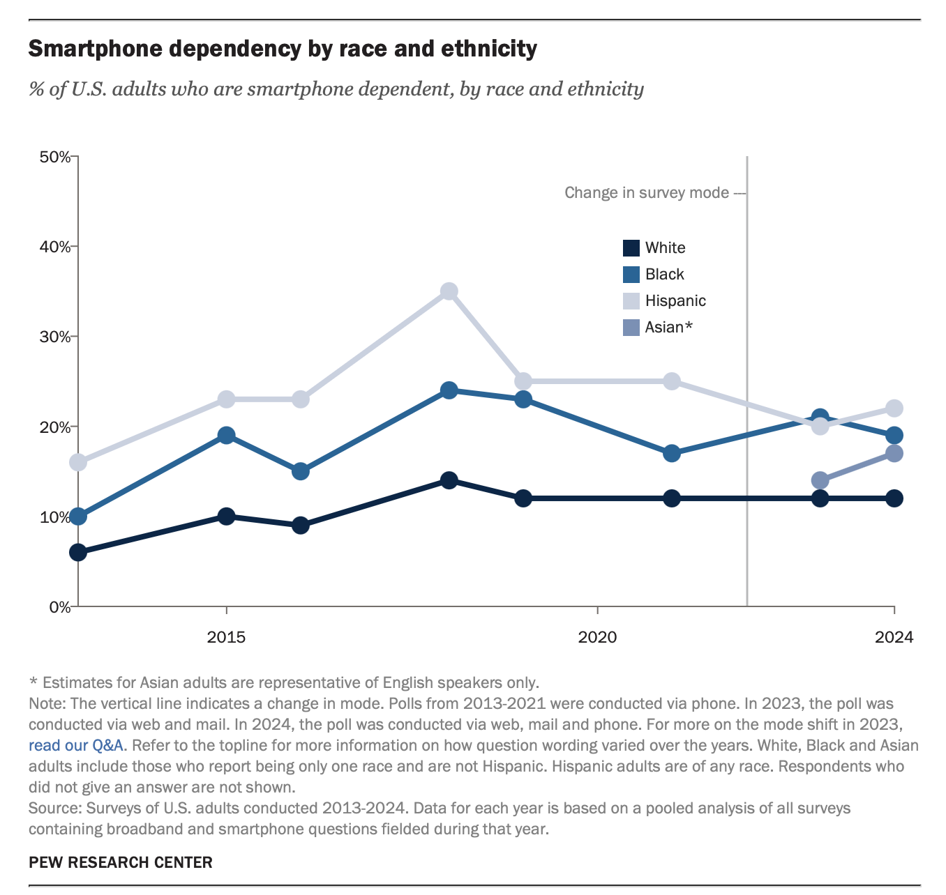 A chart from the Pew Research Center illustrates the varying percentages of smartphone dependency among U.S. adults by race and ethnicity from 2013 to 2024.