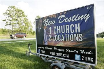 AP Photo/John Raoux-A sign with a photo of Pastor Zachery Tims is seen near the street at the New Destiny Christian Center in Apopka, Fla., Monday, Aug. 15, 2011. Tims, the pastor of one of the largest congregations in central Florida, was found dead in a hotel room in New York.