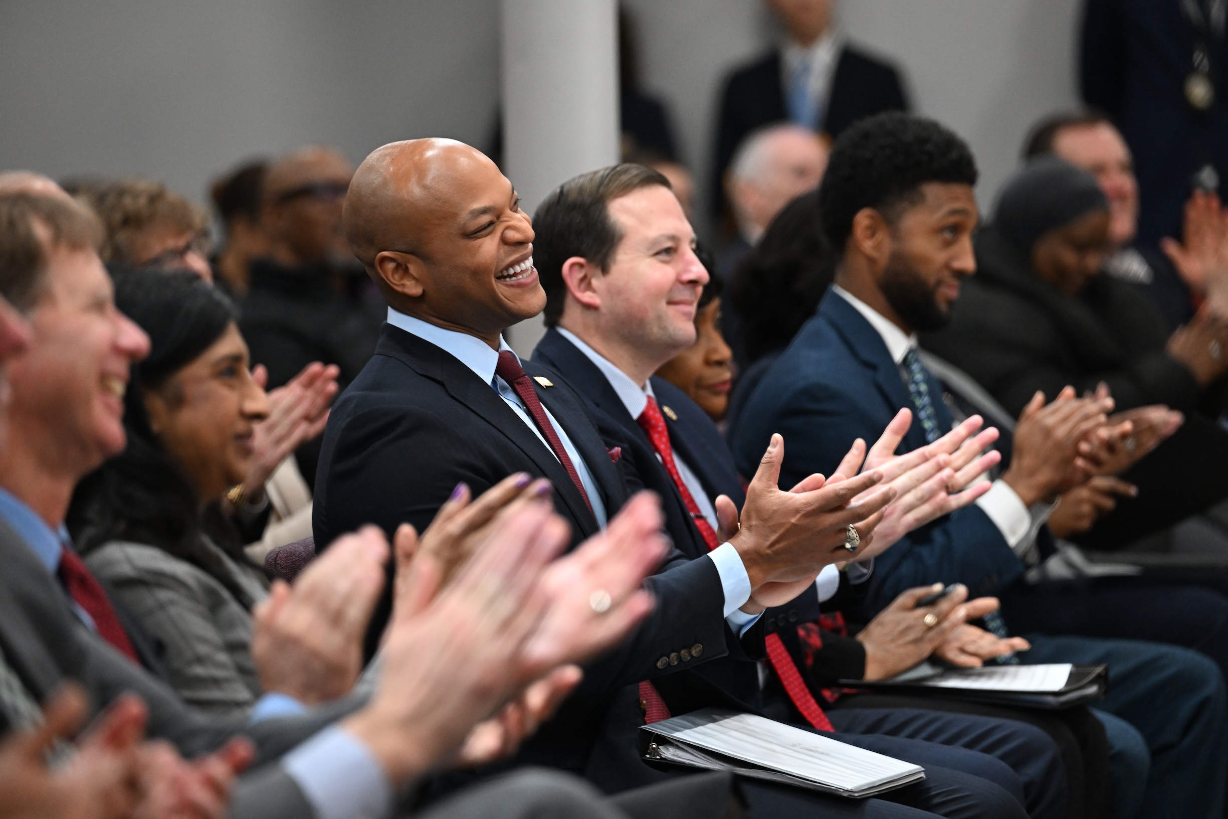 Lt. Gov. Aruna Miller (left), Gov. Wes Moore, Maryland Senate President Bill Ferguson, Maryland House Speaker Adrienne A. Jones and Baltimore Mayor Brandon M. Scott show their support for the governor’s Engaging Neighborhoods, Organizations, Unions, Governments, and Households Grant Program (ENOUGH Act), SB482/HB694, which aims to tackle poverty throughout Maryland using state-level funding. (Photo courtesy of the Executive Office of the Governor)
