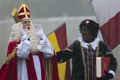 Saint Nicholas, left, and “Zwarte Piet” of Black Pete greeted children when arriving in the historic city of Gouda, Netherlands, Saturday, Nov. 15, 2014. Black Petes, the traditional black-faced sidekicks of Sinterklaas, the Dutch version of Santa Claus, walked side-by-side with yellow-colored “Cheese Petes” and “cookie Petes,” a nod to the city’s most famous products, but also a concession to critics of the traditional Black Petes. Ever more, the children’s fairy tale that has delighted kids for generations is being framed as a very politicized debate in the Netherlands, where discussion about the place in society of immigrants has simmered for years. (AP Photo/Peter Dejong)