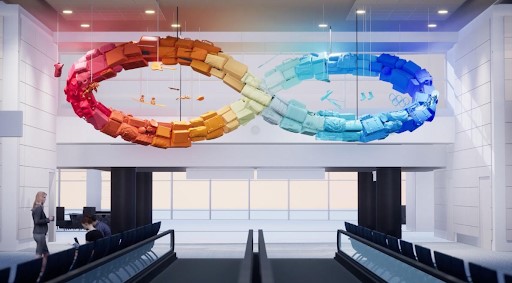 At 30 feet long, 20 feet wide, and 10 feet high, Evans’ sculpture will consist of vibrant rainbow-colored luggage, twisting and contorting into an infinity symbol, suspended in the air above the bustling airport foot traffic on the B-East concourse.