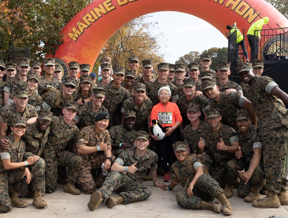 - U.S. Marines celebrate with Soon Kim (middle), the last runner in the 48th Marine Corps Marathon. Kim took home the Penguin Award, which is presented to the last person to cross the finish line. The award is given in honor of the life and service of public affairs officer and marathon runner Maj. Megan McClung, who was killed in action in Iraq in December 2006.