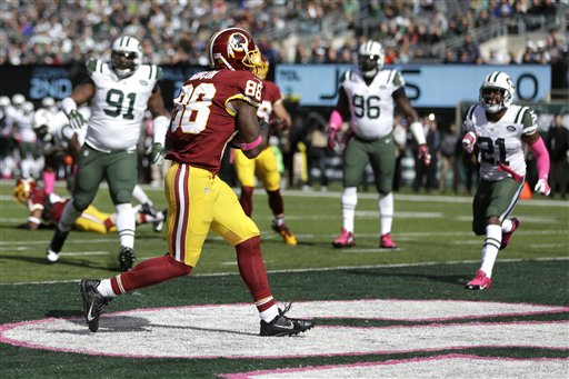 Washington Redskins wide receiver Pierre Garcon scores on a touchdown catch against the New York Jets during the first half of an NFL football game, Sunday, Oct. 18, 2015, in East Rutherford, N.J. (AP Photo/Seth Wenig)