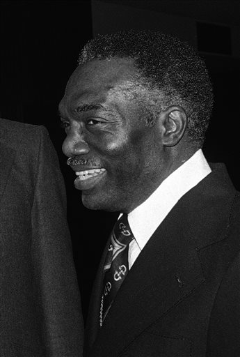 FILE – In this Saturday, March 10, 1979 file photo, President of Fisk University Walter Leonard congratulates John Hope Franklin of the University of Chicago during a ceremony in Chicago. Leonard, a man who designed an admissions process at Harvard University that led to more minority students being admitted, died at 86 of complications from Alzheimer’s disease earlier in December 2015, his wife Betty Leonard said. (AP Photo)