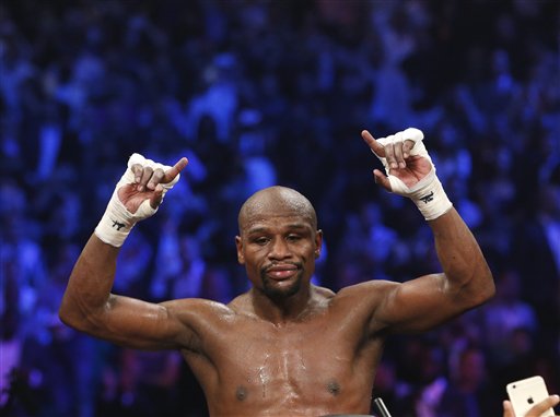 Floyd Mayweather Jr., celebrates his unanimous decision victory over Manny Pacquiao, from the Philippines, at the finish of their welterweight title fight on Saturday, May 2, 2015 in Las Vegas. (AP Photo/John Locher)